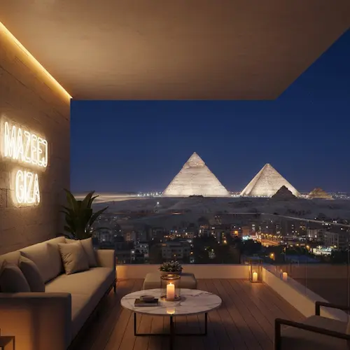 • شرفات واسعة وإطلالات مباشرة على الاهرامات تسمح الشرفات بالتهوية الطبيعية والدخول المستمر للهواء النقي، مع حماية من أشعة الشمس المباشرة.